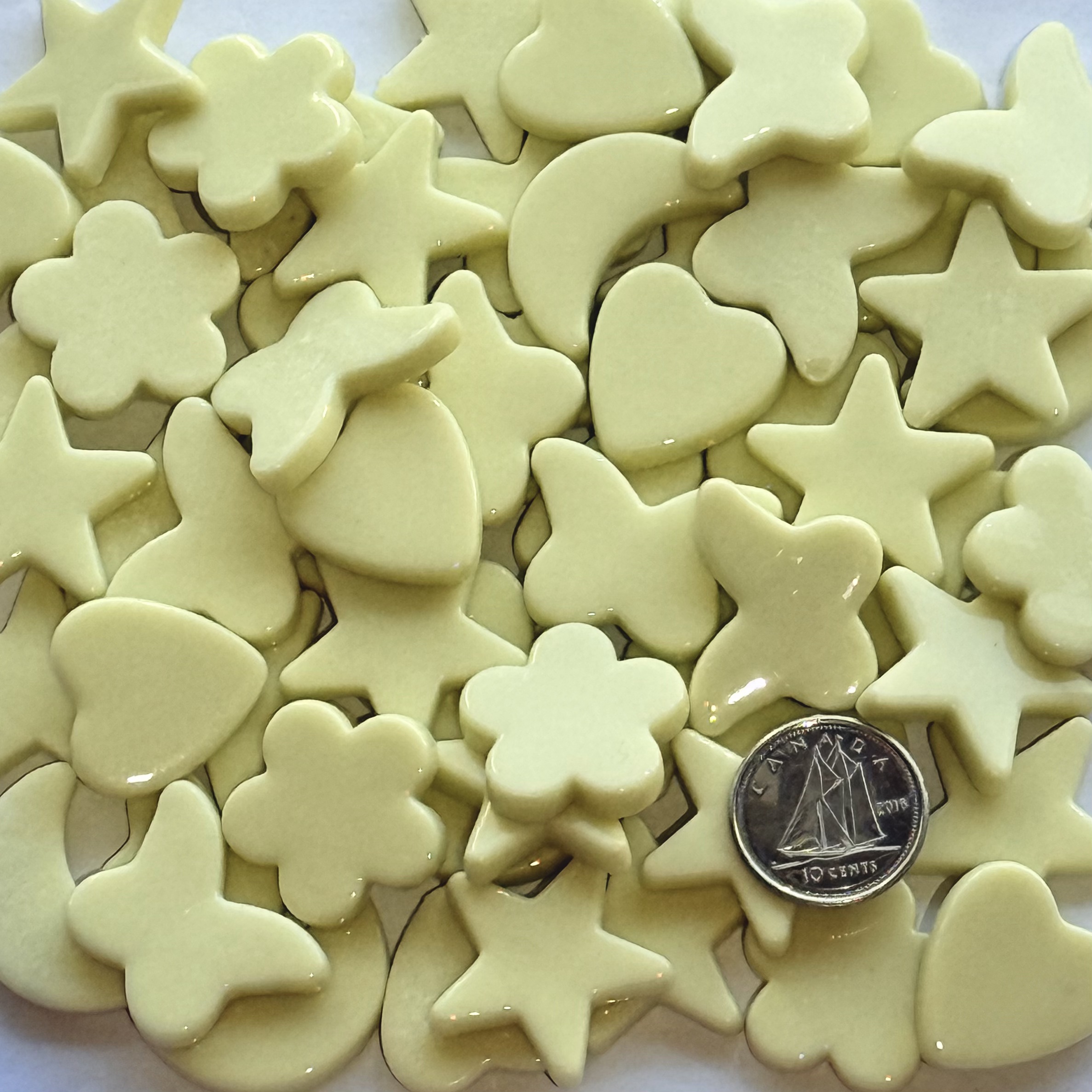 Ornamental glass motifs including  Star, Crescent, Butterfly, Flower and heart, about 3/4″ x 3/4″ x 1/8″  about 180 pieces/pound