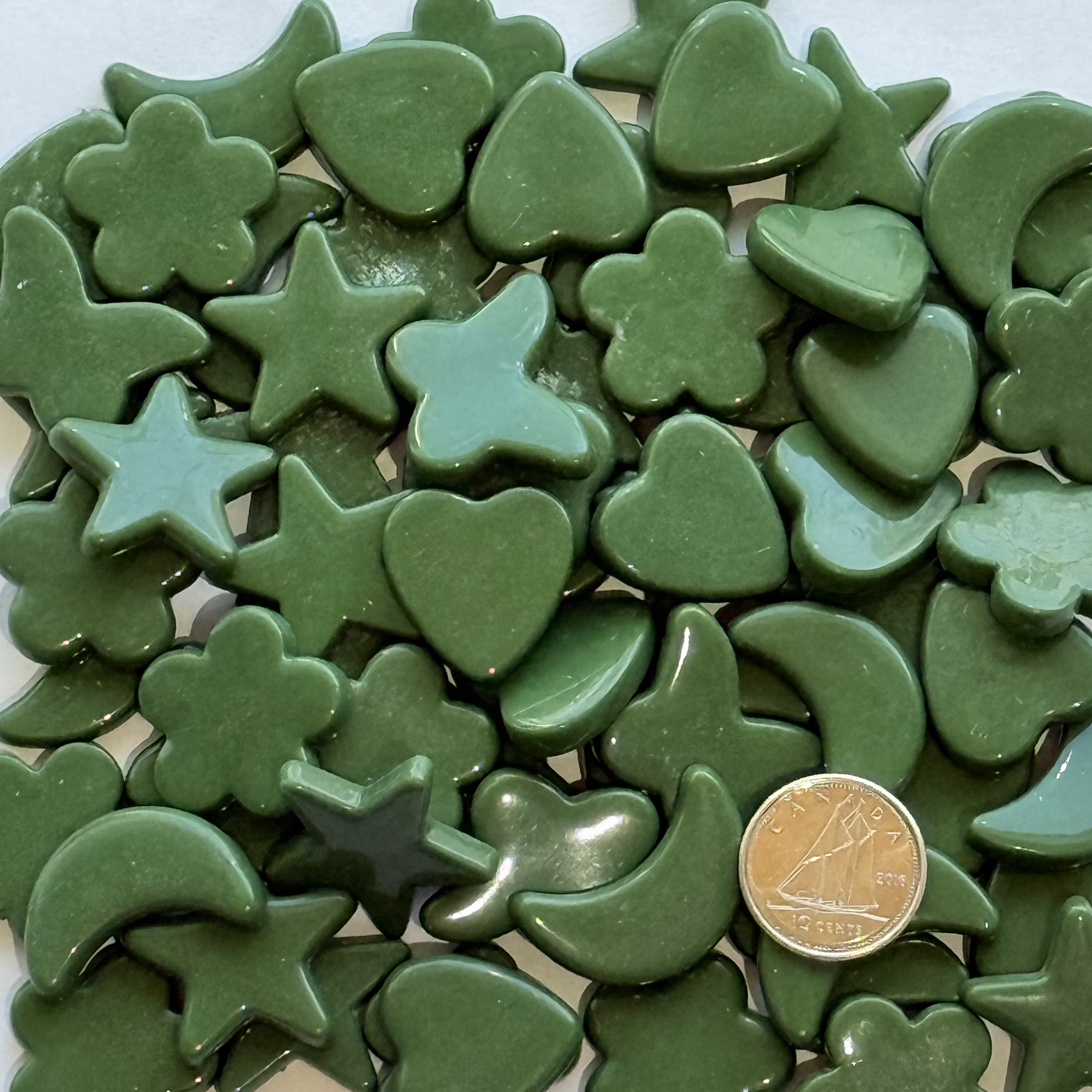 Ornamental glass motifs including  Star, Crescent, Butterfly, Flower and heart, about 3/4″ x 3/4″ x 1/8″  about 180 pieces/pound