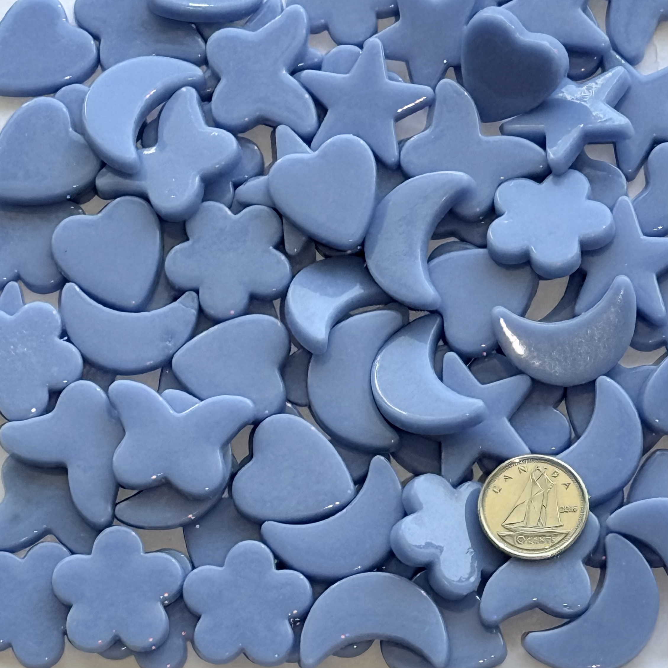 Ornamental glass motifs including  Star, Crescent, Butterfly, Flower and heart, about 3/4″ x 3/4″ x 1/8″  about 180 pieces/pound