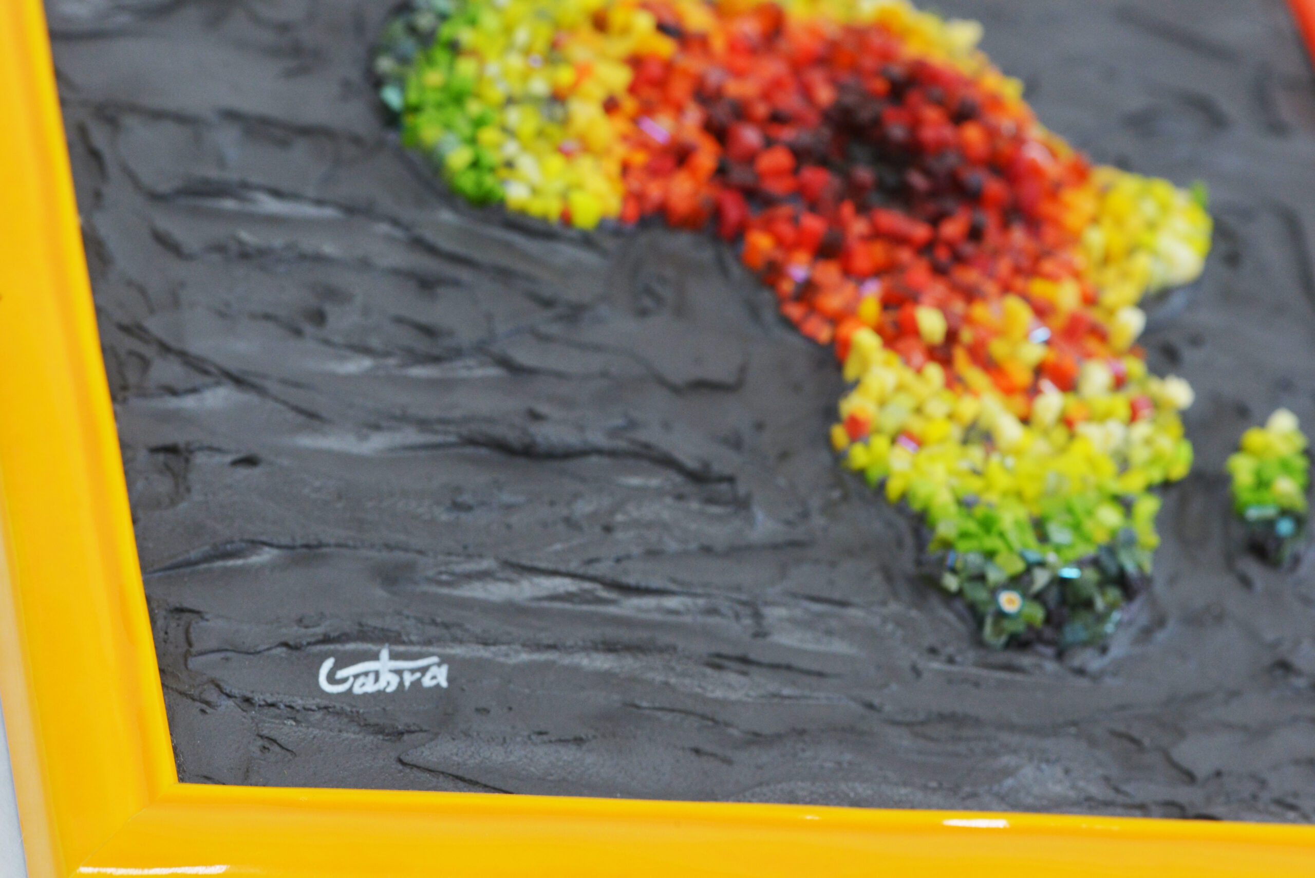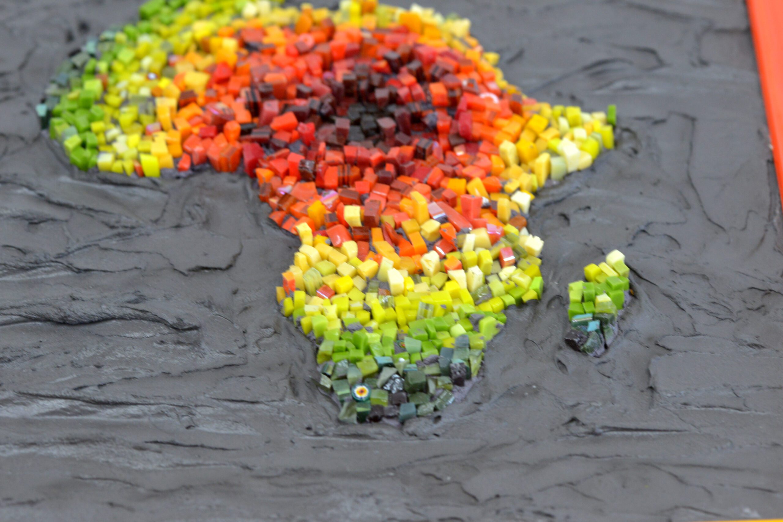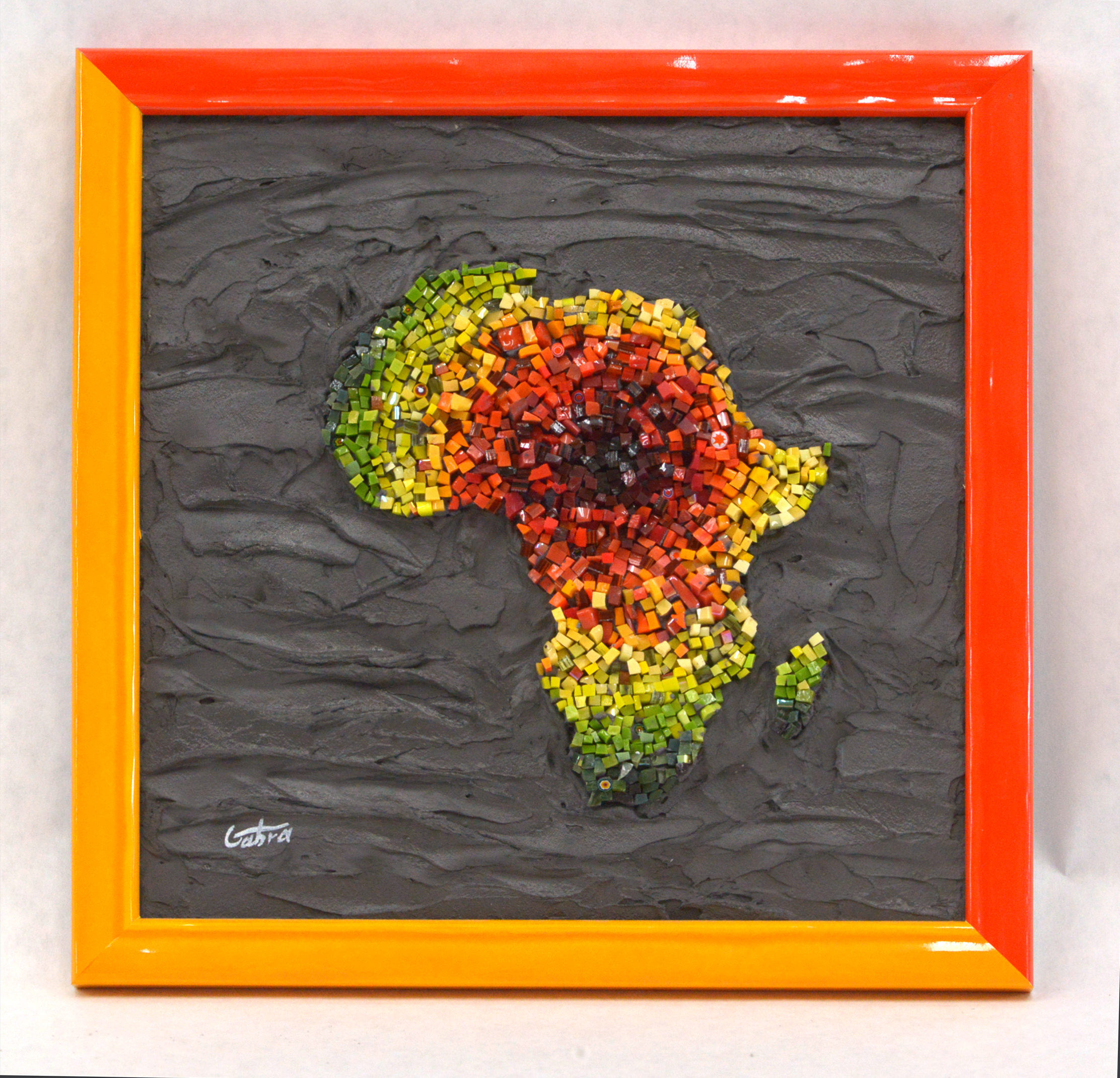 The continent of Africa in micro mosaic, framed with solid wood frame from Roma Moulding. Size: 9″ x 9″