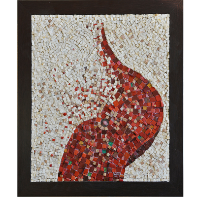 Influnced by the natural body curves, the red colours are mix of different materials (smalti, vitreous glass tiles, opus romano, millefiori) and the back ground natural stone cut to about 7mm x 7mm