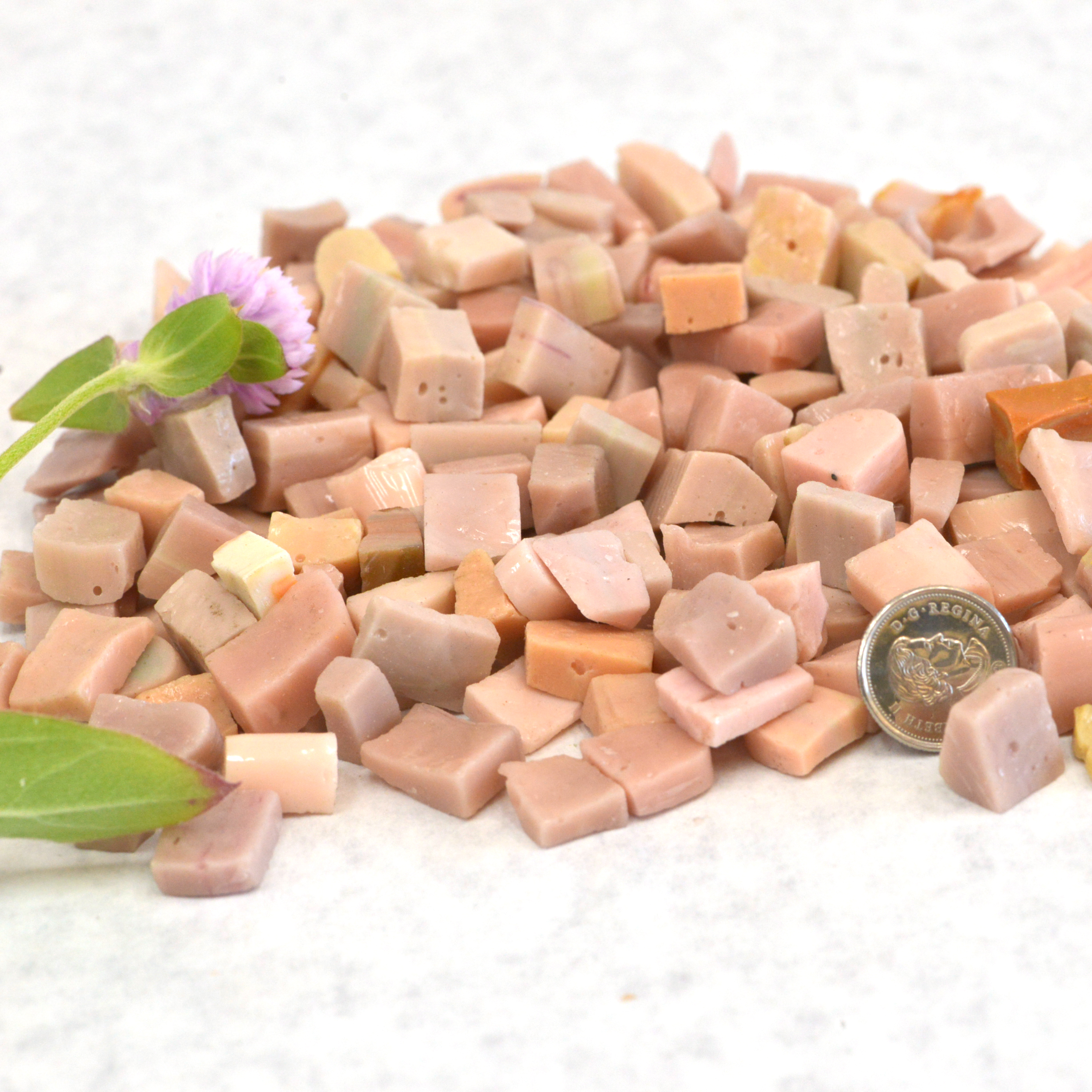 Rough cut flesh tone smalti, We all know that “one man’s trash is another man’s treasure” this bits and pieces of left over smalti after cutting the pizzas (tortilla) into tesserae. They ended up with irregular pieces, chunks, slivers, and the best is the rounded edge pieces. Great for the wide range of varity in shape and colors. Rich material for creation by real artists.