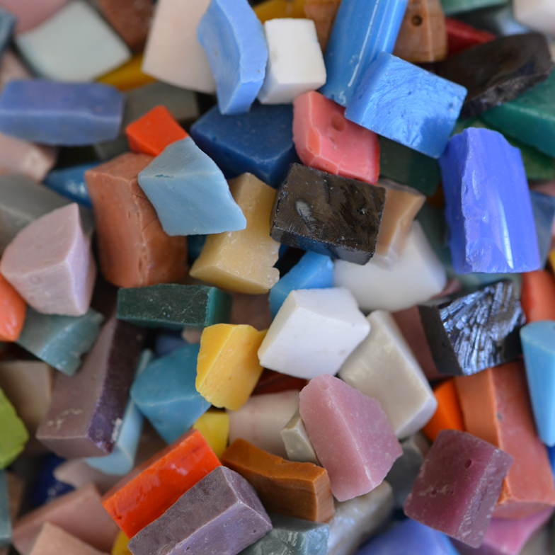 Rough cut multi color smalti, We all know that “one man’s trash is another man’s treasure” this bits and pieces of left over smalti after cutting the pizzas (tortilla) into tesserae. They ended up with irregular pieces, chunks, slivers, and the best is the rounded edge pieces. Great for the wide range of varity in shape  and colors. Rich material for creation by real artists., can be cut by Montolit nippers or a hammer and hardie.